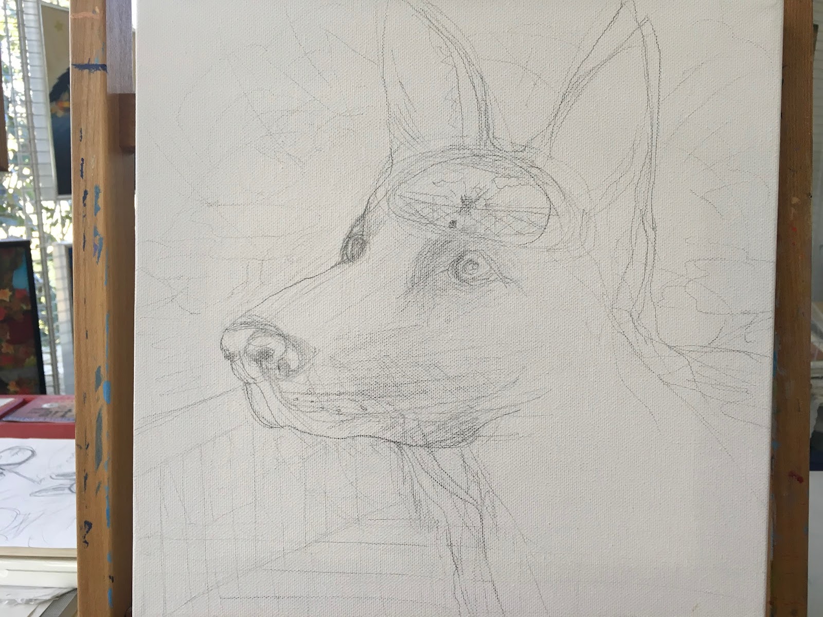 In the studio, I started with pencil drawings and then light washes in oil. I used photos of my dogs for reference, and also sketched them in pencil on paper for practice first. Lately, I like to use Holbein Aqua Oils, which I would describe as a cross between acrylic and oil. The pigment quality is very high, yet they thin with water and work really well for the the first wash of color. I’m also playing around using them underneath Gamblin oils, a popular professional oil, for my larger pieces. On these pieces though I only used the Holbein oil.