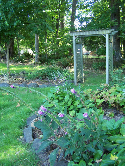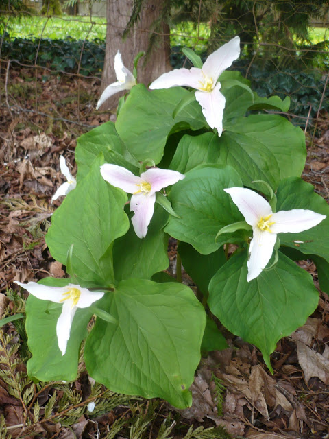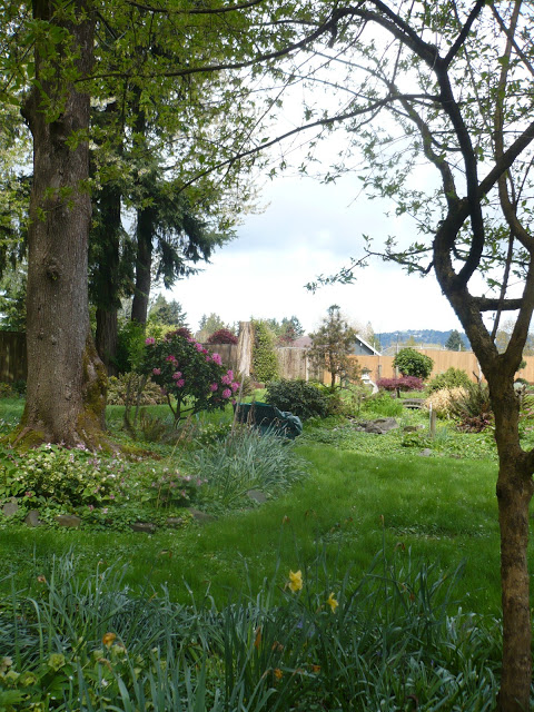 In the back is an old growth forest with trees that are 30-40 yrs old. Lots of cherry trees, evergreens, ferns, trillium, maples, foxglove, fuschia, and more I have yet to recognize 🙂