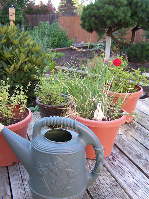 Right off the deck is a stunning trumpet flower vine. And the deck is the perfect place for all my potted herbs, mini roses and annuals.