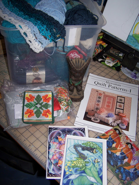 And finally some Hawaii art/craft inspiration… I brought home this beautiful hibscus needlepoint canvas to stitch, quilt patterns in cross stitch, and art cards by visionary artist Francene Hart and Warren Rapozo, a contemporary hawaii painter. When we got home, I started an ocean waves table runner in crochet inspired by the beautiful, mesmerizing oceans. The table runner is small shell stitch, and the five shades of white and blues will repeat in rows. The pattern is from this book 280 Crochet Shell Patterns.