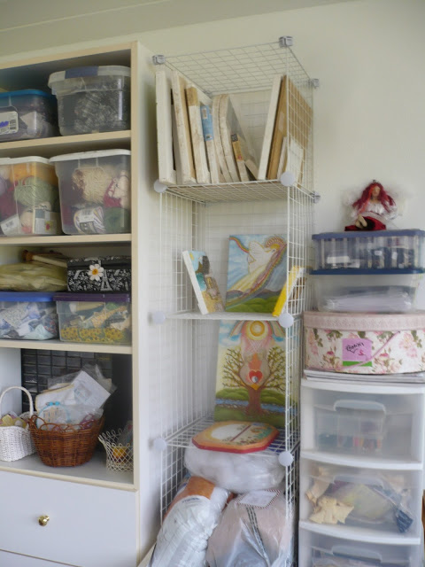 Here’s where my paintings dry… I used bookshelf cabinets and bins for storage. Love all the space it creates and they don’t need much wall space. (As you can see the room is mostly windows!)