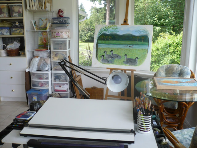 The painting in the background is Nene Dreams. This piece is a commission inspired by the endangered Hawaiian Nene goose, state bird of Hawaii. Next I will add a border of beautiful Hawaiian flowers like plumeria, hibiscus, ginger and heliconia around the edges.