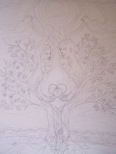 Right now in my studio, I’m excited to be working on a new piece, ‘Soulmates’. Here’s my first sketch on canvas for this piece. It’s all about eternal love, balance, and spirit connection. A yin-yang is in the center of the heart to symbolize balance. They emerge from a magnolia tree, with its large blooms. A wild rose bush grows at the bottom of the tree. Birds flutter by a double rainbow in the clouds 🙂