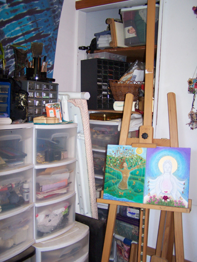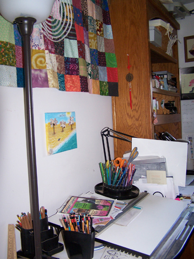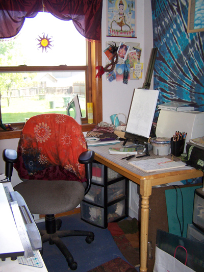 Here’s a mini tour of my studio 🙂 It has two work tables, a computer desk, a closet, and a beautiful window that looks out to our garden. (Update: see my new studio since 2013 here)